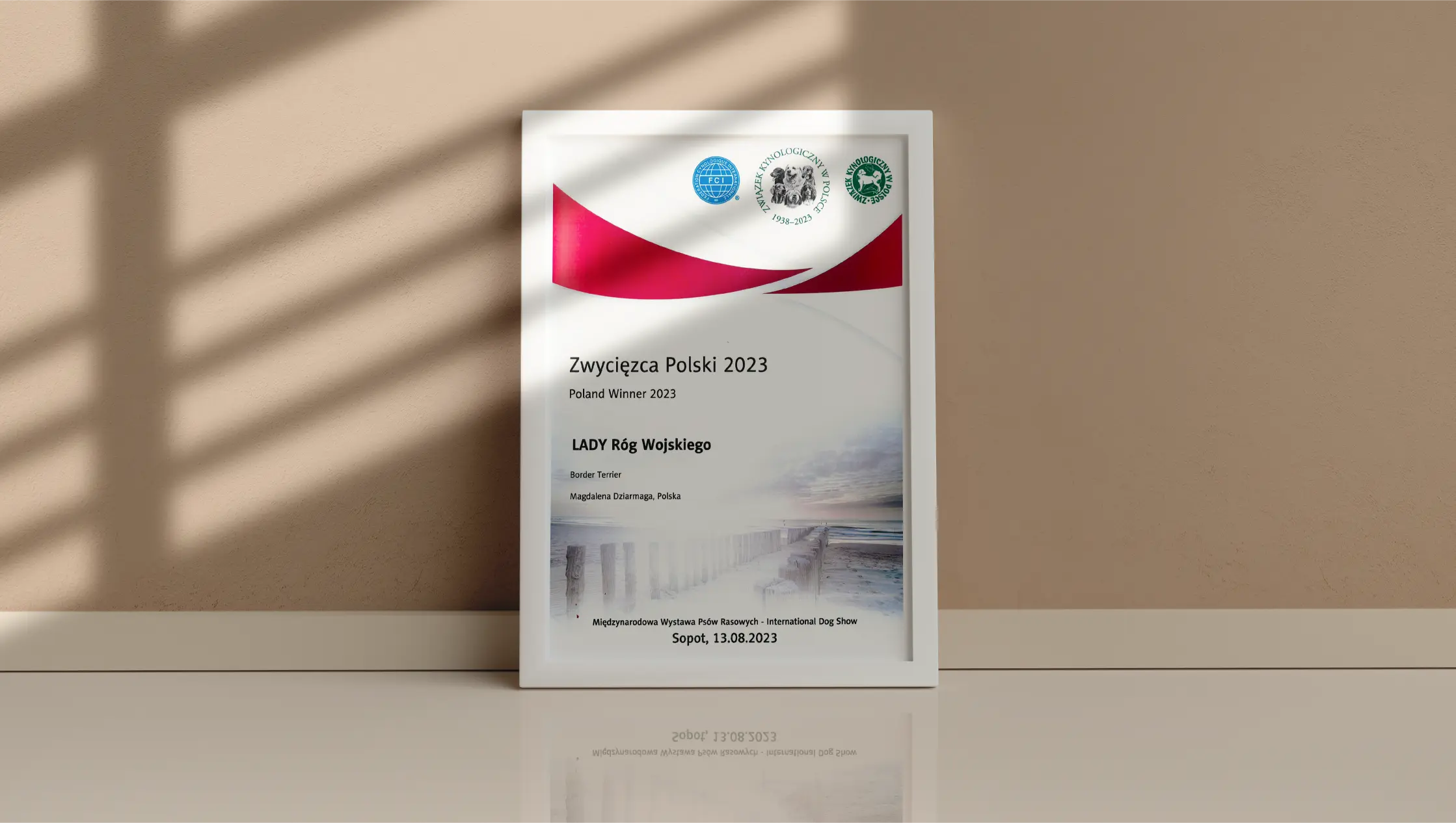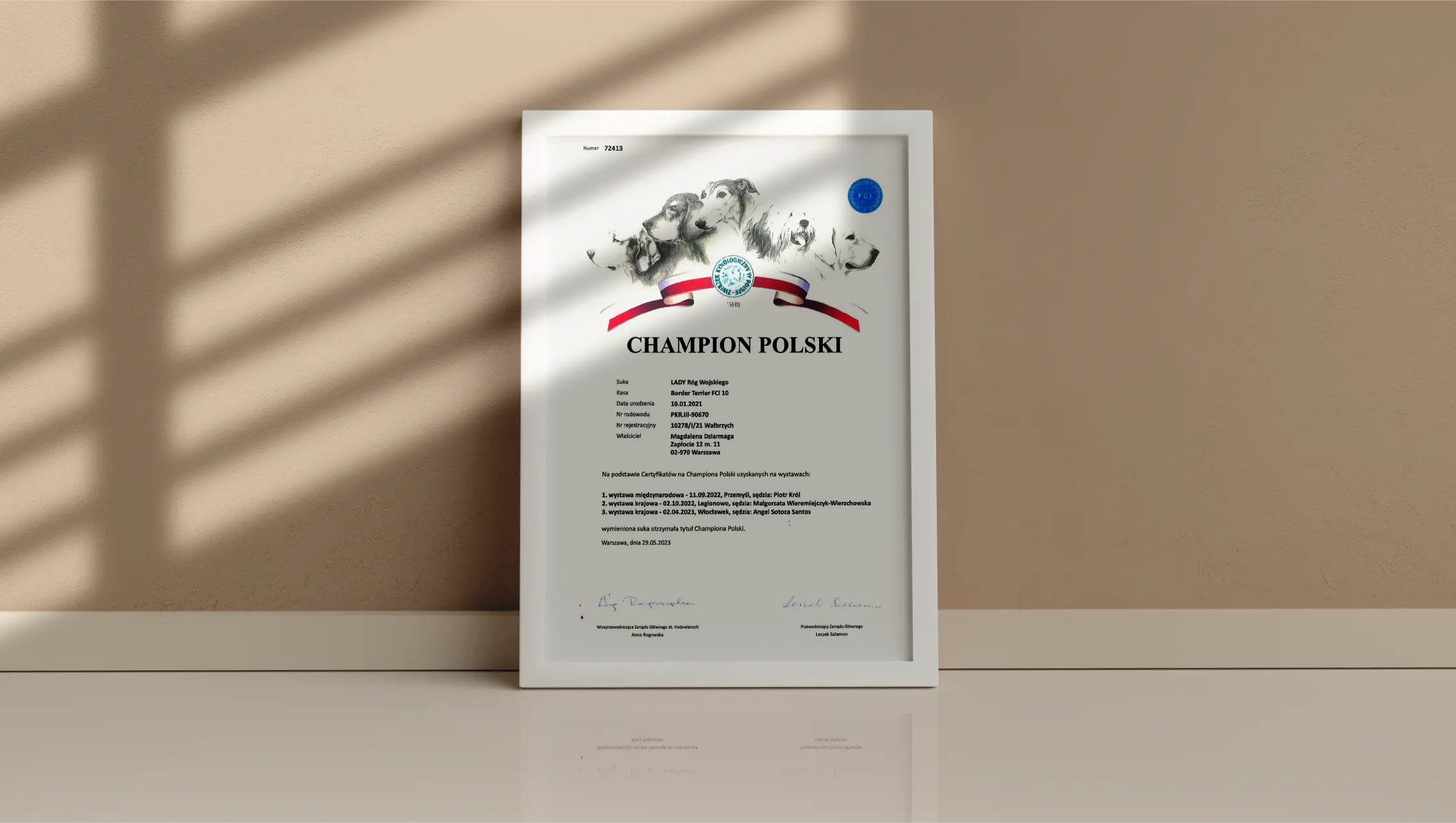 2023 rok był podróżą pełną emocji i wyzwań, oznaczającą dla mnie spełnienie osobistych marzeń. Nigdy nie sądziłam, że będę miała przywilej spotkać tylu wspaniałych właścicieli border terrierów. Reflektując nad wydarzeniami, muszę przyznać, że odczuwam ogromną satysfakcję z sukcesów naszej ukochanej Lady, która zdobyła wiele prestiżowych tytułów: C.I.B - Międzynarodowy Champion, Grand Champion Polski, Champion Polski, Champion Litwy, Zwycięzca Polski 2023, Zwycięzca Grand Prix na Słowacji 2023 oraz Nominacja do Crufts 2024.