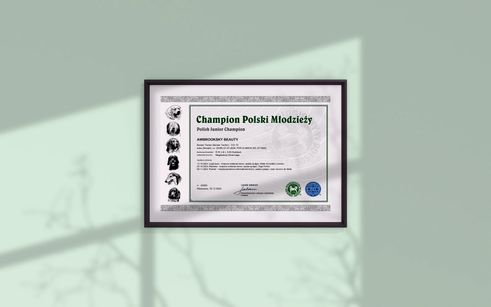 Nasza nowa gwiazda, Beauty, również zachwyca swoimi osiągnięciami. Od momentu dołączenia do nas w maju 2024, zdobyła bardzo obiecujące oceny. Startując w 7 wystawach krajowych i międzynarodowych, siedmiokrotnie uzyskała tytuł Wybitnie Obiecującego, trzykrotnie zdobyła tytuł Najlepszego Młodszego Szczenięcia w Rasie oraz raz tytuł Najlepszego Młodszego Szczenięcia w Grupie 2. Jej sukcesy budzą w nas niezwykłe emocje i jesteśmy z niej bardzo dumni. Beauty ma obecnie 6 miesięcy i już zdobyła nominację do tytułu „Champion Polski Szczeniąt”.